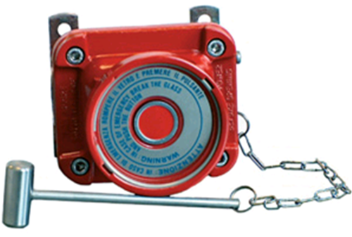 Pulsante manuale convenzionale adatto al montaggio in aree classificate. L'attivazione dell'allarme avviene premendo il pulsante, dopo la rottura del vetro. Provvisto di martelletto per la rottura del vetro e contenitore in alluminio fuso di colore rosso.