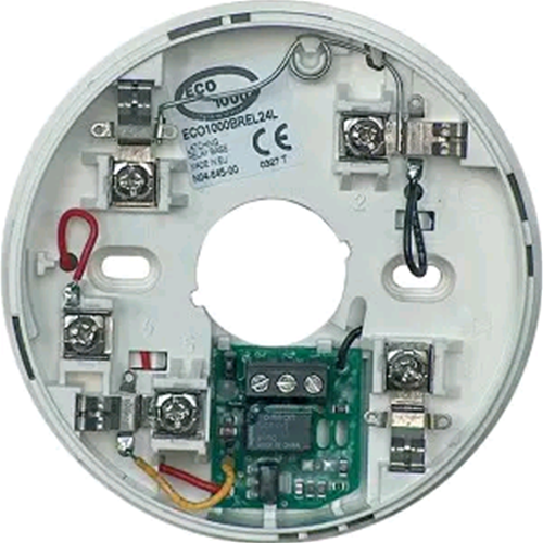 ECO1000BREL24L Notifier Base di colore bianco con relè 12/24 Vcc per rivelatori convenzionali serie ECO. E' possibile collegare alla base un ripetitore ottico-acustico.