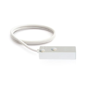 Sensore inerziale di rilevazione rottura vetro a vista di colore bianco. Utilizza la tecnologia magnetica per il rilevamento delle vibrazioni. Basato su un nuovo principio ibrido inerziale/magnetico, non e soggetto a vincoli di posizionamento.