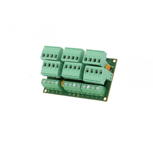 BUS Hub si collega al BUS della centrale e dispone di 6 morsettiere estraibili a cui possono essere collegati 6 rami distinti di BUS. Ogni ramo di BUS ha il positivo di alimentazione protetto con un fusibile termico autoripristinante da 0,5A. Sono presenti altri 4 morsetti per il collegamento di positivi di alimentazione (anche essi protetti da un fusibile da 0,5A) e 4 morsetti per il collegamento dei negativi. Cavi in dotazione.