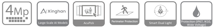 Telecamera dome IP AI WizSense Xinghan Smart Dual Light da interno/esterno IP67 antivandalo IK10, sensore CMOS progressivo 1/2.9", risoluzione 4 MP a 25fps, AI coding, H.265+, ICR, ottica fissa M12 2.8 mm F1.4, luminosità 0.005 lux ƒ1.4, portata IR/warm light fino a 30 m, microfono integrato, 1 porta LAN 10/100 Mbps, IVS (protezione perimetrale), SMD 4.0, AcuPick (con NVR AcuPick), AI SSA, privacy mask 8 aree, 3D NR, WDR 120 dB, micro SD card (512 GB), alimentazione 12 Vdc/PoE <4.2 W