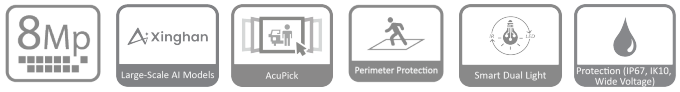 Telecamera dome IP AI WizSense Xinghan Smart Dual Light da interno/esterno IP67 antivandalo IK10, sensore CMOS progressivo 1/2.7", risoluzione 8 MP a 25fps, AI coding, H.265+, ICR, ottica fissa M12 2.8 mm F1.4, luminosità 0.005 lux ƒ1.4, portata IR/warm light fino a 30 m, microfono integrato, 1 porta LAN 10/100 Mbps, IVS (protezione perimetrale), SMD 4.0, AcuPick (con NVR AcuPick), AI SSA, privacy mask 8 aree, 3D NR, WDR 120 dB, micro SD card (512 GB), alimentazione 12 Vdc/PoE <4.2 W