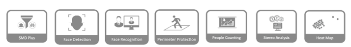 > L'intelligenza artificiale della fotocamera supporta il rilevamento e il riconoscimento facciale, la protezione perimetrale, SMD Plus, il conteggio delle persone, l'analisi stereo e la mappa di calore.