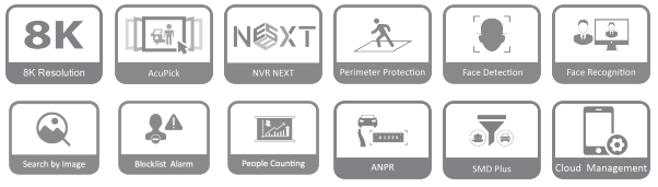 NVR IP AI WizSense 32 canali fino a 32 MP (encoding), 8 canali a 8 MP (decoding), max. banda 448 Mbps, H.265+, 4 uscite video (2 VGA + 2 HDMI), 16 ingressi e 6 uscite allarme, 1 ingresso e 2 uscite audio (RCA), predisposto per montaggio di 4 dischi SATA (fino a 20 TB cad.), 1 porta eSATA, 3 porte USB (1x 2.0 e 2x 3.0), 1 porta RS232, 1 porta RS485, 1 porta RJ-45 10/100/1000 Mbps + 16 porte PoE 10/100 Mbps (<200 W, 1~8 ePoE), 8 canali protezione perimetrale, 4 canali face detection/face recognition, 16 canali SMD Plus, 4 canali AcuPick (con telecamera AcuPick), 4 canali metadati video, 1.5U, alimentazione 100-240 Vdc <13 W senza Hard Disk