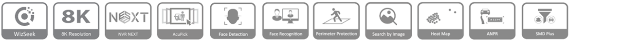 NVR IP AI WizMind Xinghan 64 canali fino a 32 MP (encoding), 10 canali a 8 MP (decoding), max. banda 512 Mbps, H.265+, 4 uscite video (2 VGA + 2 HDMI), 16 ingressi e 8 uscite allarme, 1 ingresso e 2 uscite audio (RCA), predisposto per montaggio di 8 dischi SATA (fino a 20 TB cad.), 1 porta eSATA, 4 porte USB (2x 2.0 e 2x 3.0), 1 porta RS232, 2 porte RS485, 2 porte RJ-45 10/100/1000 Mbps, 32 canali protezione perimetrale, 16 canali face detection/face recognition, 32 canali SMD Plus, 16 canali AcuPick (con telecamera AcuPick), 16 canali metadati video, 2U, alimentazione 100-240 Vac <18 W senza Hard Disk